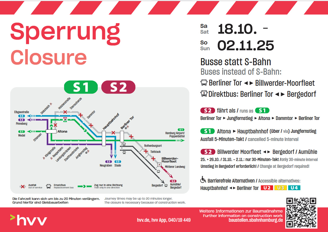 - Besondere Wochenend-Regelung: Am 25. und 26. Oktober sowie vom 31. Oktober bis zum 2. November fährt die S2 auf dem verbleibenden Streckenteil nur alle 30 Minuten. Hier ist ein Umstieg in Bergedorf erforderlich.
